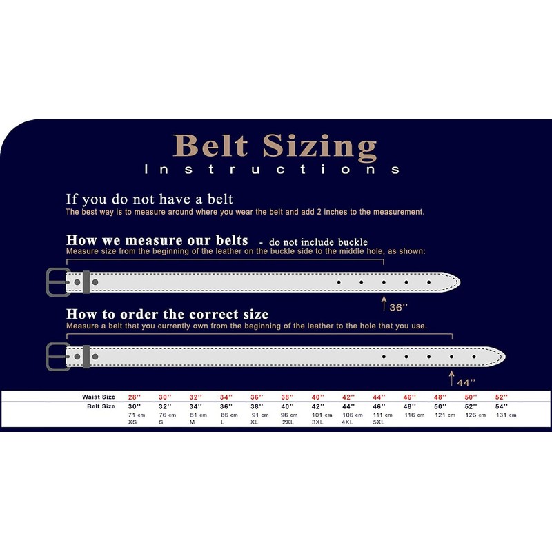 - ★★★ How to measure your Belt size ★★★: The best way is to measure around where you wear the belt and add 2 inches to the measurement. Our belts are measured from the fold where the buckle is attached to the middle hole. If you want to get the best size we recommend measuring a belt that works for you from the fold to the hole where you wear the belt.