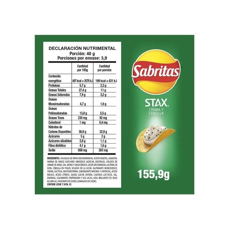 - Las Hojuelas de papa sabor crema y cebolla Sabritas Stax brindan el sabor completo que estabas buscando. La botana posee una textura crujiente. Sabritas estará presente en cada festejo que tengas y en los buenos momentos con exquisitos sabores.