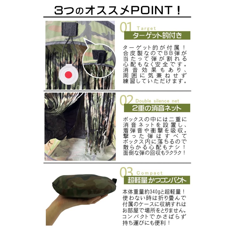 - Target Included: Comes with a target so you can start shooting practice immediately. The target is made of synthetic leather, so even if you hit BB bullets, you can safely use it without worrying about it breaking the bullet, and it has a noise reduction effect so you can practice without worrying about it