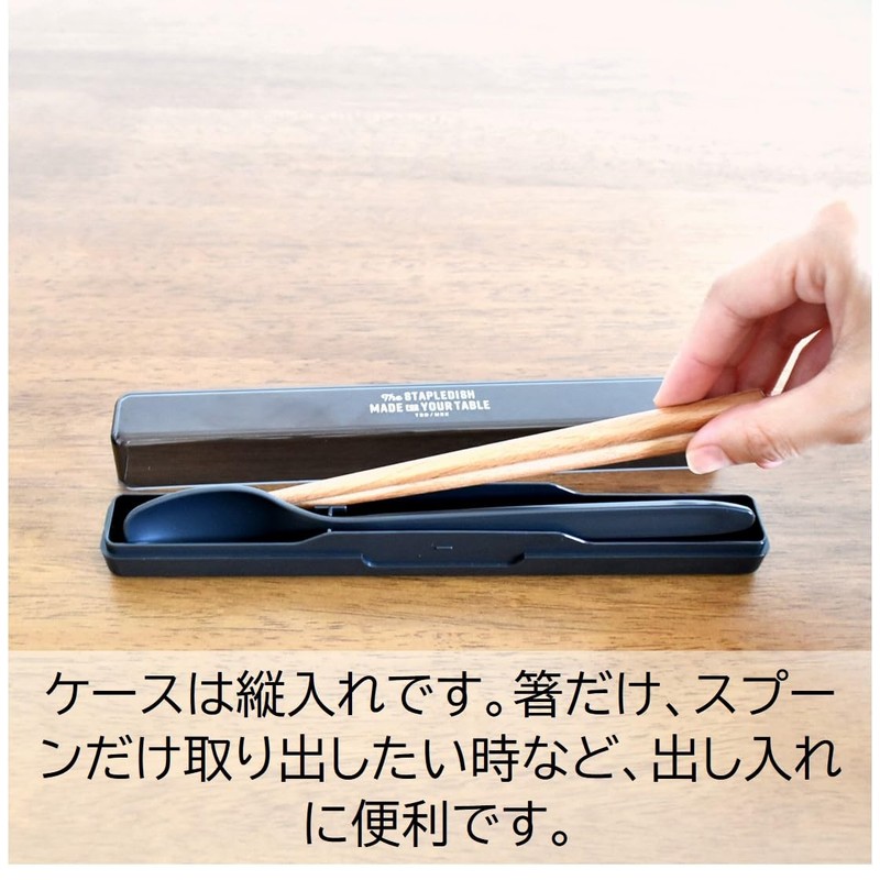 シャープでシックな雰囲気のステイプルユニシリーズ。落ち着いたグリーンの箸&ケースのセット。ケースは縦入れタイプで、箸だけ、スプーンだけ取り出したいときなど、出し入れに便利です。箸、スプーンは大きい手でも使いやすい箸全長20cm。全パーツ食洗機対応でお手入れ簡単。安心の日本製。