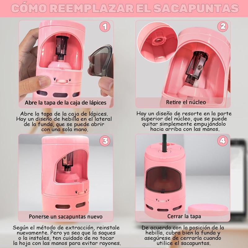 - 【Sacapuntas automático】: Desliza el botón en la parte posterior del fuselaje hasta la función de afilado de lápices, abre la cubierta superior, coloca las pilas AA, coloca el lápiz en el agujero del medio y el sacapuntas comenzará a afilarse automáticamente, liberando completamente tus manos.La punta tiene diferentes opciones de afilado, desde opaca hasta afilada. El sacapuntas se detendrá automáticamente cuando se sobrecaliente, así que asegúrese de limpiar la caja de virutas de lápiz a tiempo.