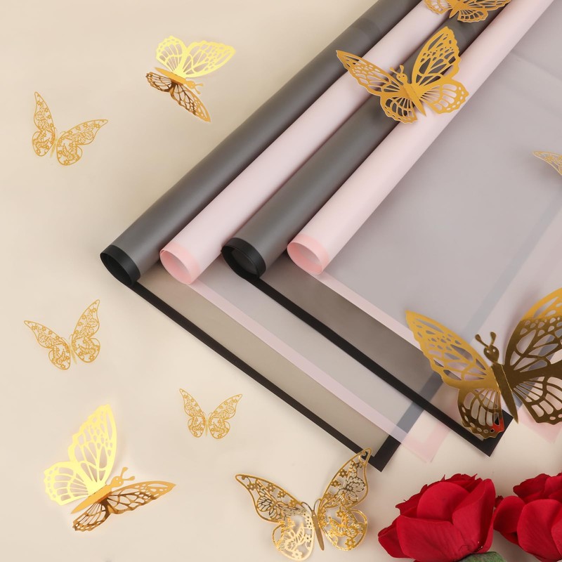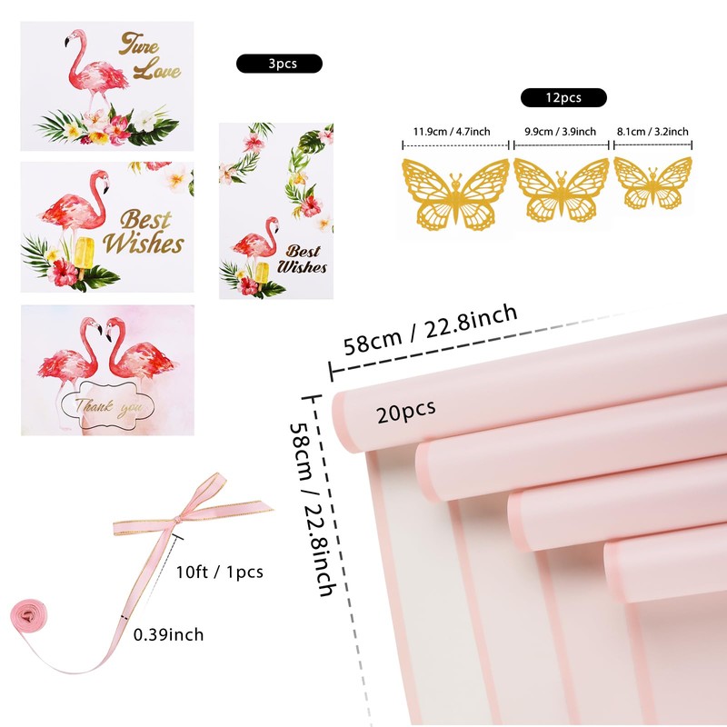 - ??Florist Wrapping Paper SetYou will get 20 sheets pink flower wrapping paper. Using classic semi transparent material, the edges are designed in white color with a frosting, smooth and comfortable to touch. 12 pcs of 3D Gold butterfly decorations, 3 cards expressing love and 10ft of ribbons. These flower bouquet supplies offer abundant choices to personalize your flower bouquets.
