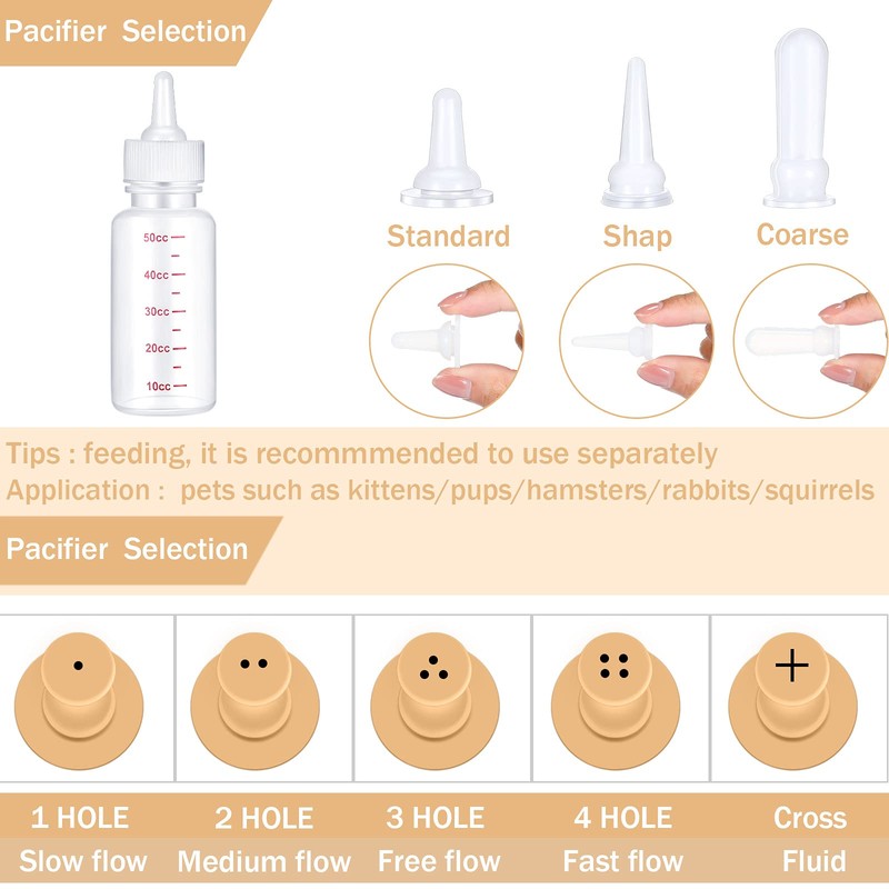 - 4 Size of pacifiers: cat nursing bottle set has 4 different styles of pacifier to use and replace, you can choose a different size to fit your pet's mouth, which is suitable for puppies, kittens or other small animals, such as hamsters, chinchillas, squirrels, rabbits, etc