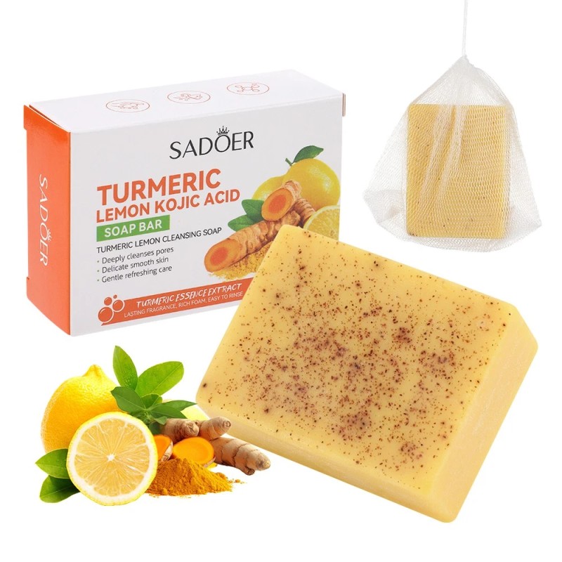 SADOER Turmeric Glow Soap Bar - Lemon & Kojic Acid, Removing Dark Spots, Deep Cleaning