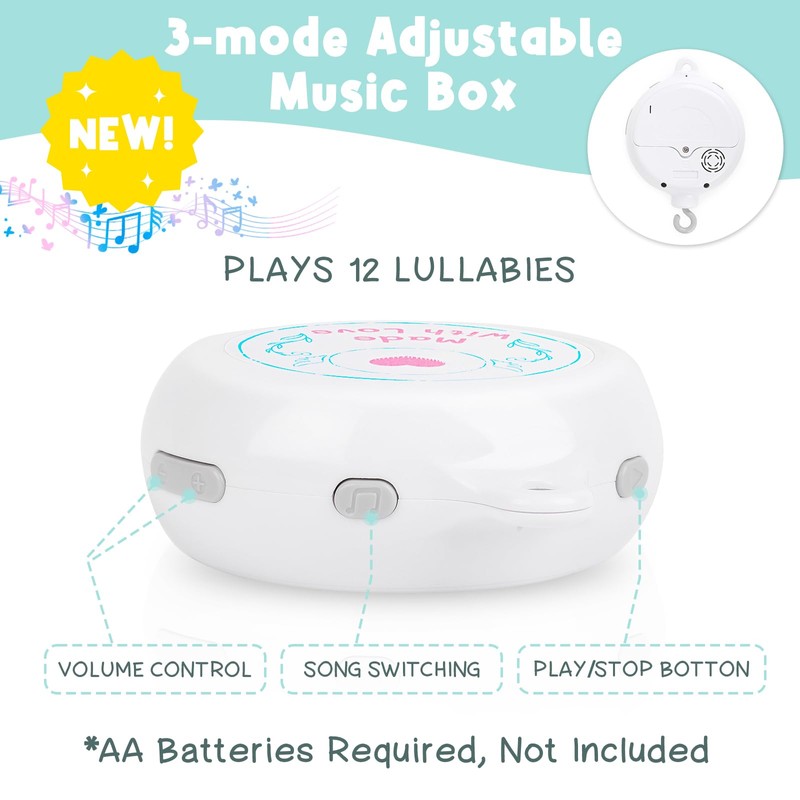 - 12 Soothing Lullabies: The newly upgraded 3-mode adjustable music box lets you choose between Rotation Only, Music Only, or Both. As the gentle melodies play, the toys slowly spin, creating a calming atmosphere that makes bedtime a smoother and more enjoyable experience for both baby and parents