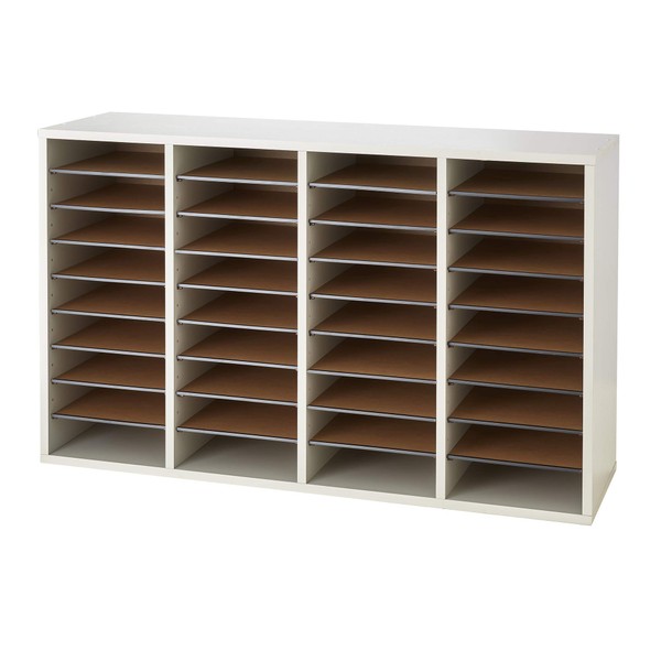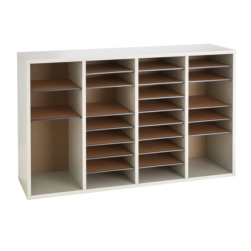 Safco Wood Adjustable Literature Organizer, 36 Compartment helps keep your office, classroom or printer room organized and running efficiently. Hardboard shelves form up to 36 letter-size compartments and remove easily to create larger storage areas for maximum convenience. Constructed of durable 5/8" furniture-grade compressed wood with an adjustable hardboard divider for long- lasting performance. The durable laminate finish complements any setting. This literature sorter can stand alone or be stacked up to three high in home offices, classrooms, and craft rooms—anyplace that needs efficient literature organization.