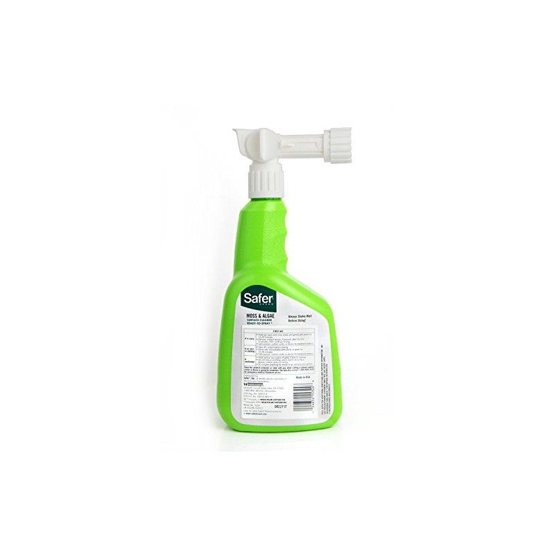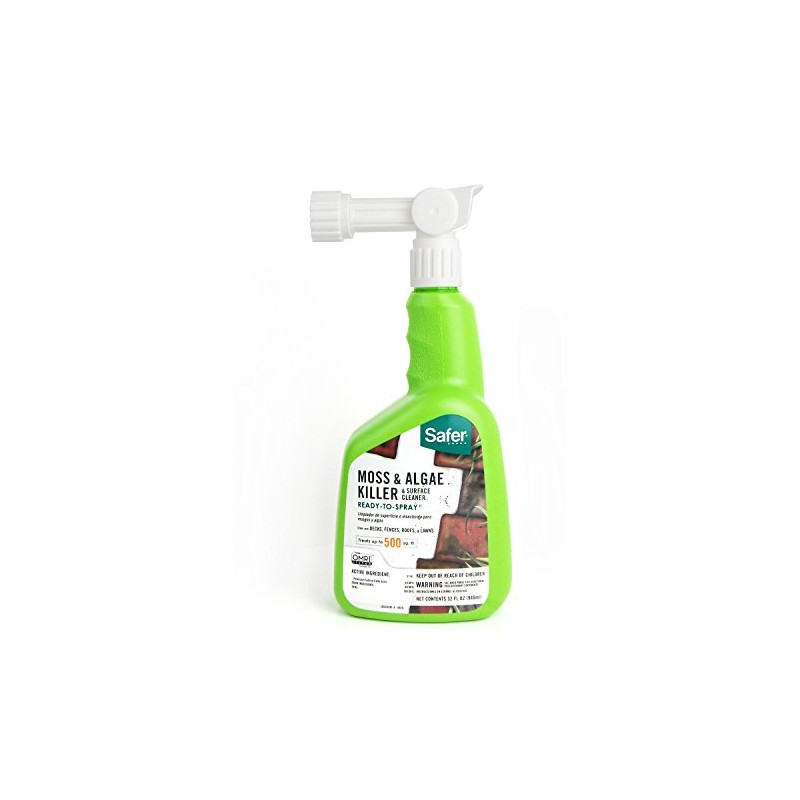 Safer Brand 32 oz. Moss and Algae Killer and Surface Cleaner utilizes the effectiveness of potassium salts of fatty acids. This product is an economical and convenient solution to the wide array of moss and algae annoyances. For use on roofs, decks, siding, walkways, home greenhouses, growing containers and benches, structural surfaces, hardened barks of trees, lawns and turf. OMRI listed for organic use. One bottle treats up to 500 sq ft.