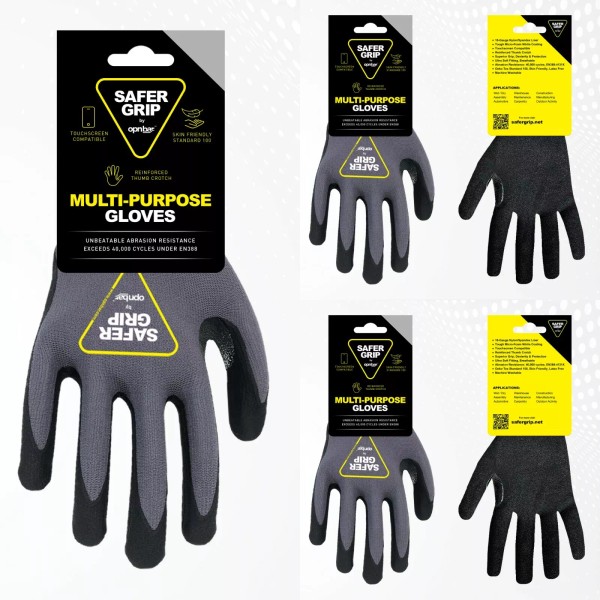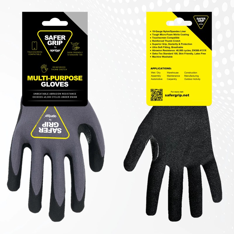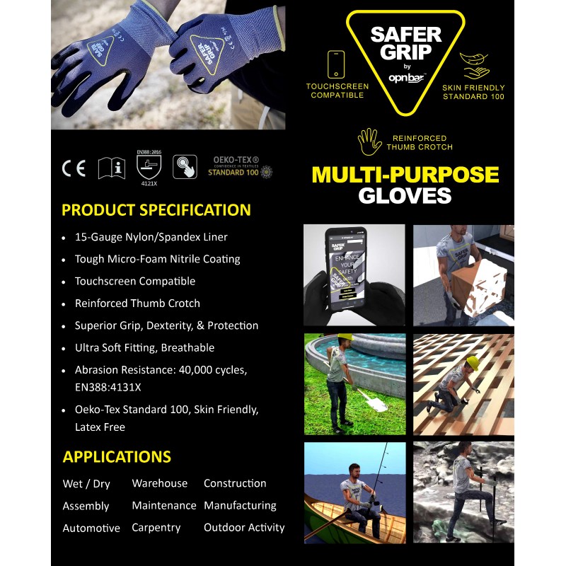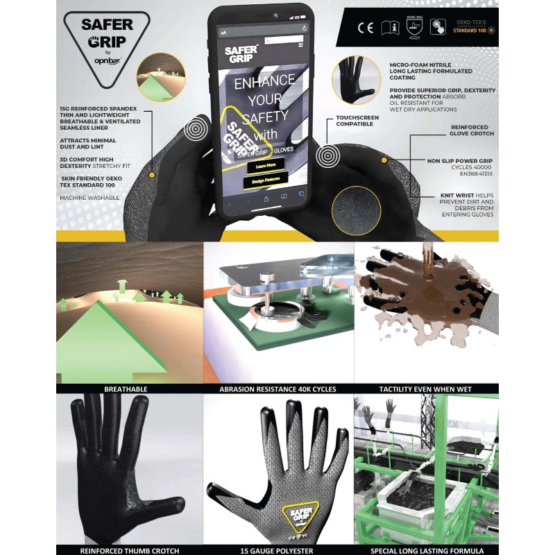 Safer Grip by OPNBar Multi-Purpose gloves are dipped in our special longer lasting formula, with a durable coating that improves tactility and dexterity. The foam coating resists cuts, abrasions, and tears, and is also a good alternative for people with latex allergies or want an alternative to leather. Our gloves are dipped in an improved nitrile microfoam formula in a three-quarter palm dip. Micro-foam technology offers great breathability, making them cool and comfortable to wear, in any environment. Safer Grip gloves are made of 15-Gauge nylon polyester engineered yarn. The glove conforms to the operator’s hand and offers maximum flexibility and comfort. Our spandex nylon glove palms are coated in micro-foam nitrile, and are quite flexible, making Safer Grip gloves the perfect nitrile foam gloves for working with tools and protecting your hands and products. Our latest glove offers a durable thumb crotch for extra grip and protection. Coated foam gloves are extremely popular, primarily because they have a good price point. They are effective and comfortable, provide great dexterity, and protect operator hands from hazards, as well as protect products from workers’ hands. Foam coatings can be applied and used in wet, oily, cold, and normal situations. Our spandex gloves with a long lasting microfoam nitrile coating are breathable with a coarse surface that can suck up oil and liquid, and maintain grip and tactility even when wet.