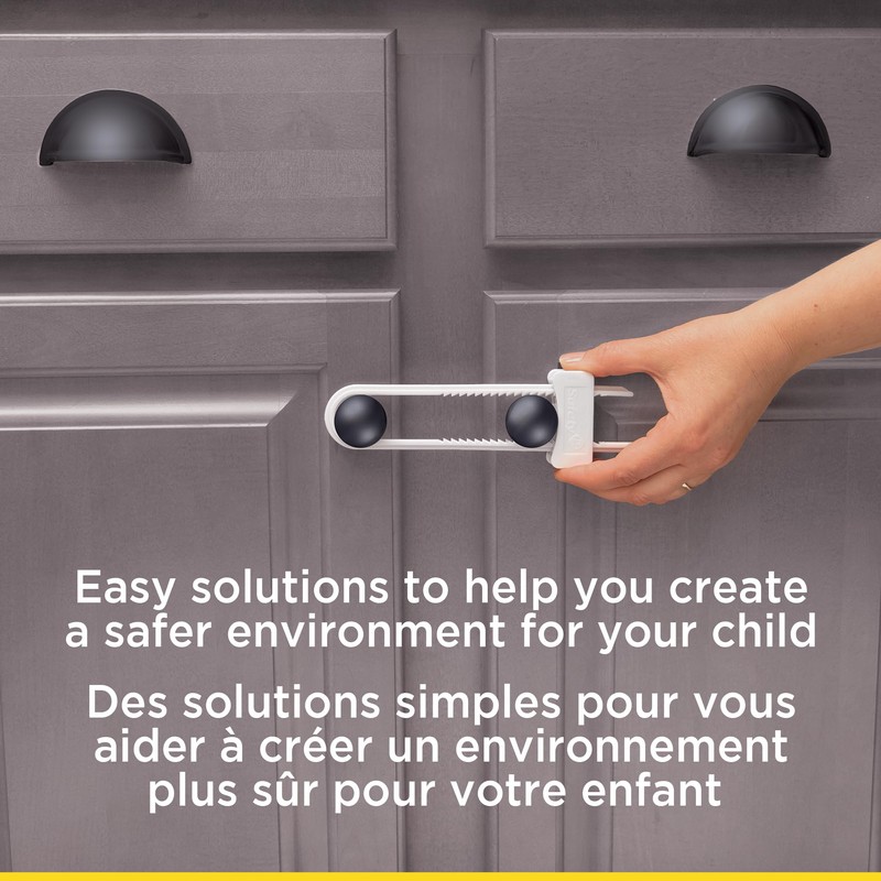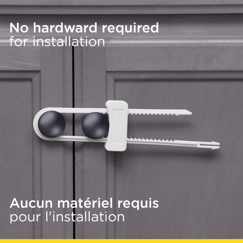 Our Cabinet Slide Lock is designed for use on most standard cabinet handles and knobs. This sturdy plastic lock will keep curious children out of cabinets. The U shaped cabinet slide lock helps prevent children from opening cabinet doors and the durable plastic construction is designed for long-lasting use. No hardware required. Easy to install and won't mar cabinets. Recommended age is 6 months and up.