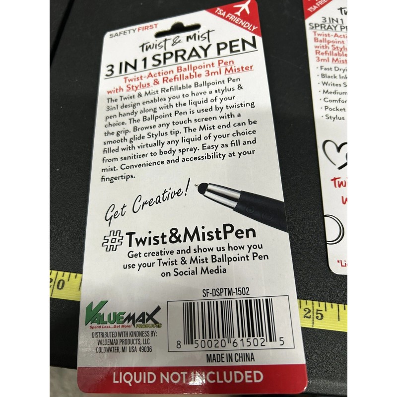 Safety First Ballpoint Pen “Twist & Mist” Stylus, Black Ink, Med. Tip, TSA Friendly, Gadget