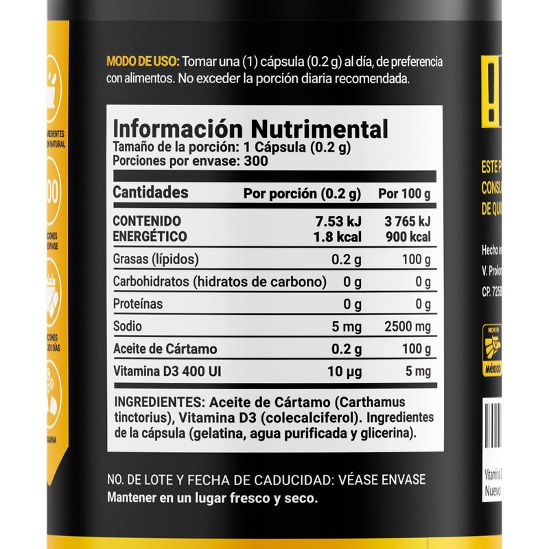 - Safflower Oil D3 Blend es un suplemento alimenticio con 300 softgels (cápsulas blandas) a base de Aceite de Cártamo y Vitamina D3 400 UI