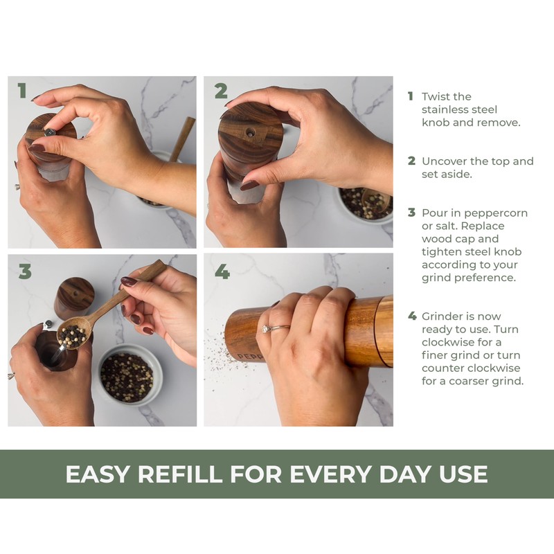 - Easy to Use: Designed for convenience, our grinder is easy to fill and effortless to use. Its ergonomic design allows for a comfortable grip and smooth grinding action which will be easy on your hands & wrists. From fine to coarse, it delivers the right grind for every dish. Turn clockwise for a finer grind or turn counter clockwise for a coarser grind.