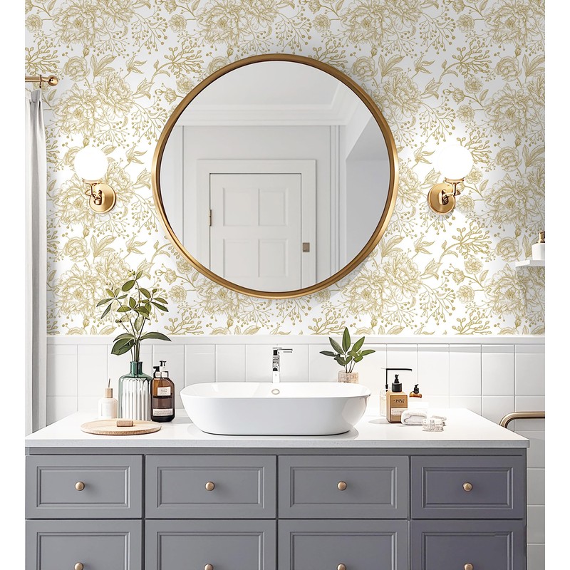 Safiyya Peel and Stick Wallpaper Boho Floral Contact Paper 78.7" x 17.3" Gold and White Wall Paper Modern Self Adhesive Removable Wallpaper for Bedroom Bathroom Vinyl Rolls