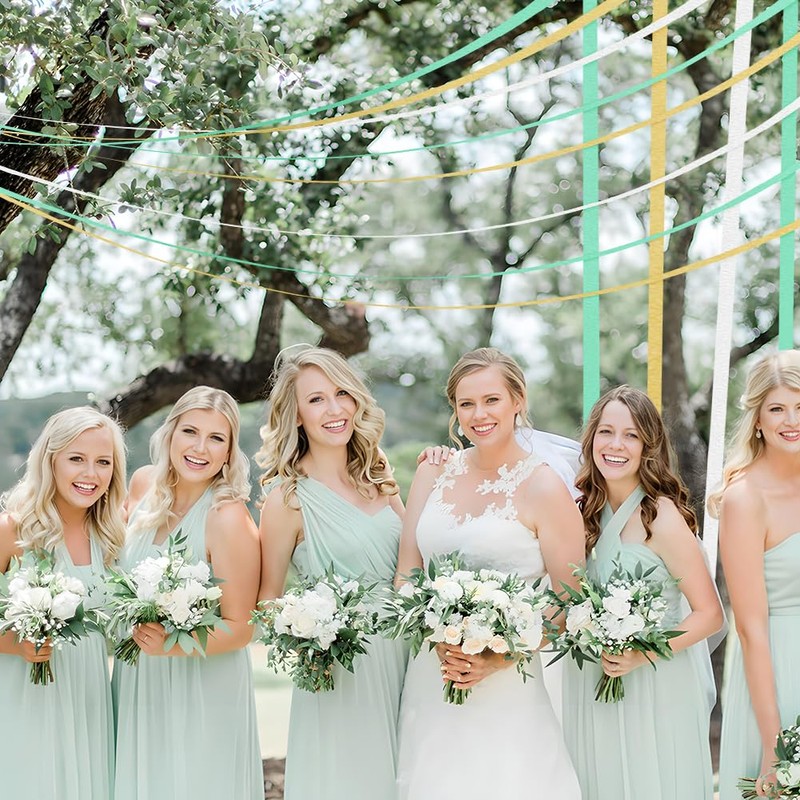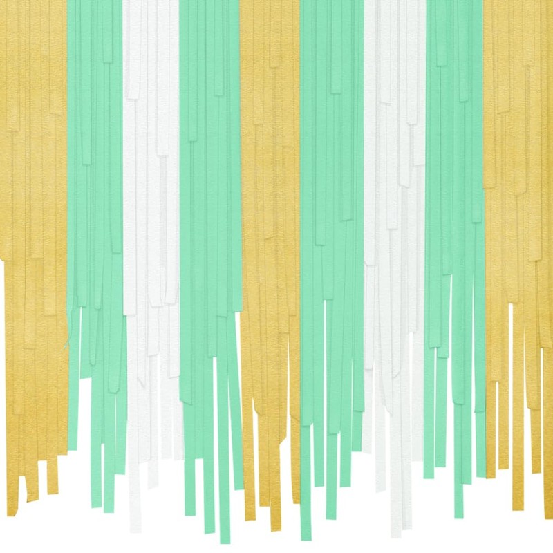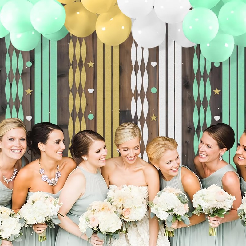 - Valued Sage Green Party Decor: 9 rolls of paper crepe curtain and 1 pack ribbon. 4 roll of sage green streamer, 3 roll of gold crepe streamer and 2 roll of white paper streamer. Size of Each Roll: length: 33ft/ 10 m ; width: 1.4 inch/ 3.5 cm