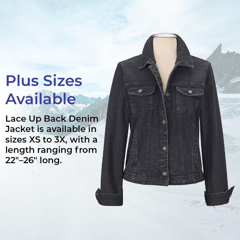- BLACK DENIM JACKET: Trendy design features a corset-style cross-lace detail on the back for a bold, edgy look; transforms a classic jean jacket from ordinary to extraordinary