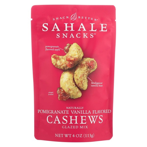 Sahale snacks naturally pomegranate vanilla flavored cashews glazed mix started with finding a rich fragrant madagascar vanilla. We grind the whole bean creating a creamy vanilla flavor and then pair it with tart pomegranate flavored apples and whole dry roasted cashews. It’s sweet tart crunchy and so worth the hunt. Every bite should be an experience: the cherished recollection of a childhood dessert or the exotic flavor of a far-flung place. So buckle up and dig in. See nutrition fact panel for allergens. Includes one 4 oz. Bag of sahale snacks naturally pomegranate vanilla flavored cashews glazed mix.country of origin : united statesis gluten free : yesis gmo free : yesis kosher : yessize : 4 ozpack of : 6selling unit : caseingredients : cashews;dried apples;unsulfured apples;sugar. Natural pomegranate flavor;citric acid;fruit and vegetable juice [for color];organic cane sugar;organic tapioca syrup;brown sugar;natural vanilla extract;sea salt;dried pomegranate;pomegranate juice concentrate;dried orange peel;pure ground vanilla beanskeywords : fiber;free;gluten;nut;protein;snack