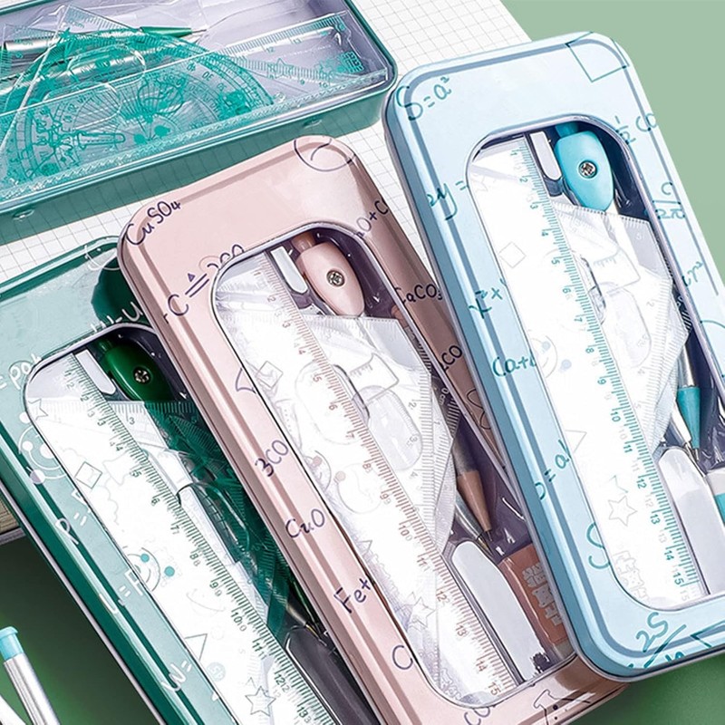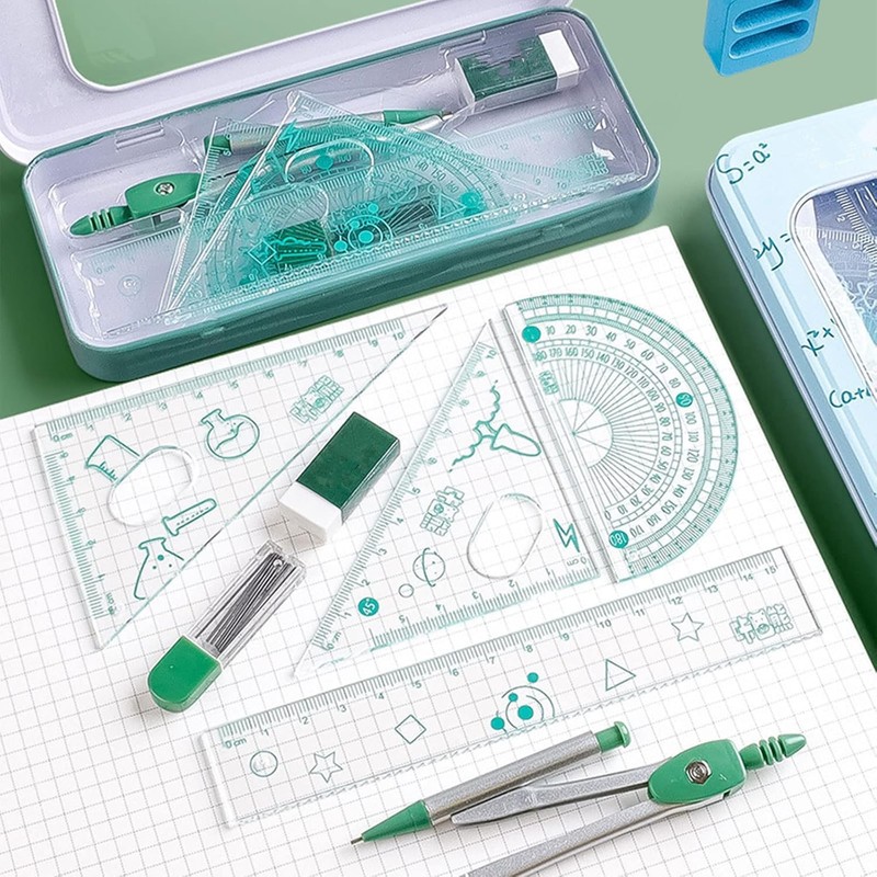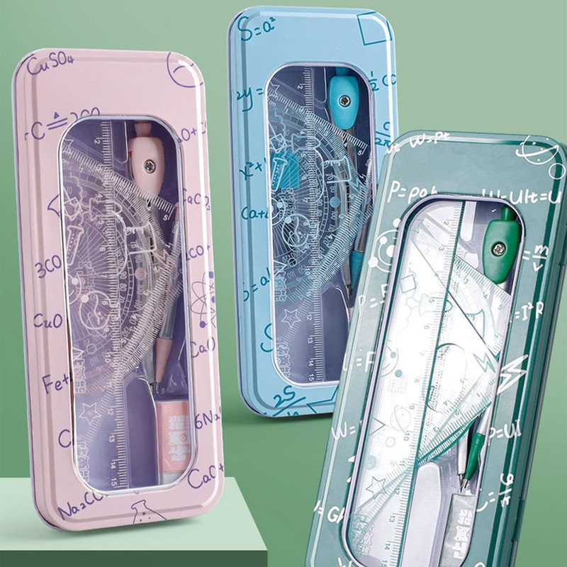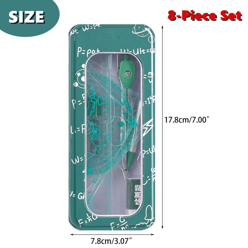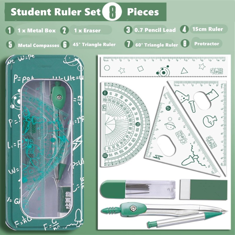 - 【You Will Get】1 metal learning compass, 2 triangles (45° and 60), long ruler, protractor, eraser, pencil lead replacement core and 1 metal box.