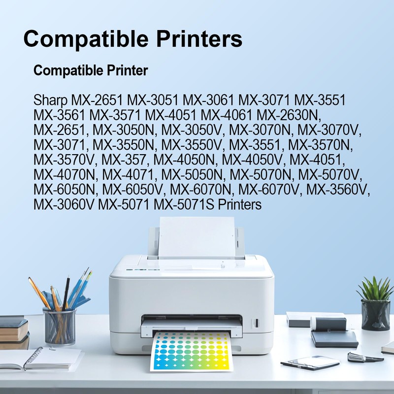 - Compatible printer: Sharp MX-2651 MX-3051 MX-3061 MX-3071 MX-3551 MX-3561 MX-3571 MX-4051 MX-4061 MX-2630N, MX-2651, MX-3050N, MX-3050V, MX-3070N, MX-3070V, MX-3071, MX-3550N, MX-3550V, MX-3551, MX-3570N, MX-3570V, MX-357, MX-4050N, MX-4050V, MX-4051, MX-4070N, MX-4071, MX-5050N, MX-5070N, MX-5070V, MX-6050N, MX-6050V, MX-6070N, MX-6070V, MX-3560V, MX-3060V MX-5071 MX-5071S Printers