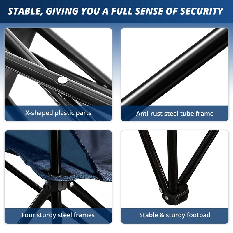 - Durable: The camping chair features thick and sturdy steel pipes, innovative X-shaped reinforcement, and four heavy-duty steel frames, providing stability and load-bearing capacity of up to 225 pounds
