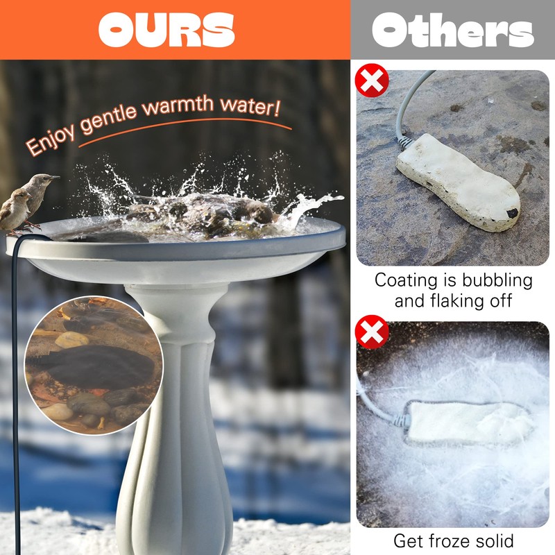 - Automatic Birdbath Water Heater: AC 120V 60Hz 60W, the outdoor bird bath de icer thermostatically controlled to operate only when necessary, prevents water from freezing due to 0 degree Fahrenheit or colder weather, offering your cute bird more care