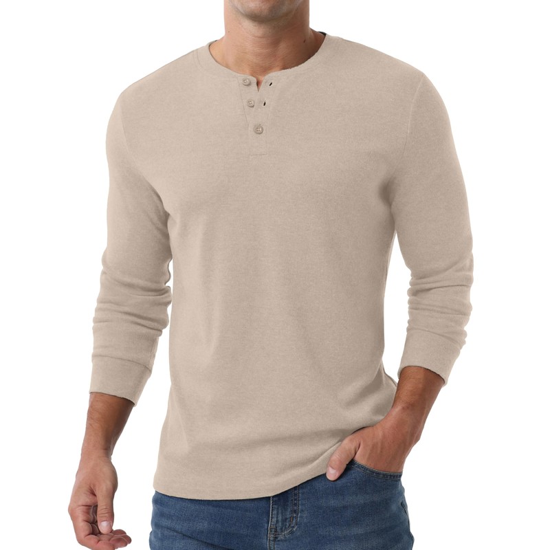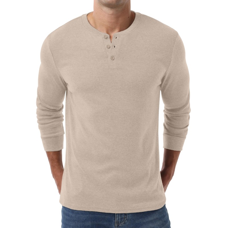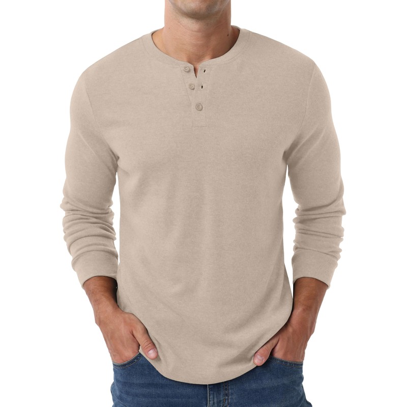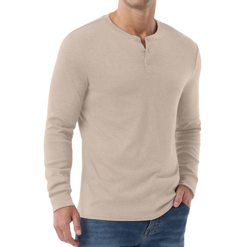 - Classic Henley - This casual stylish t-shirts features a solid color, 3-button Henley neckline, and cuffed long sleeves. Wear it as a round neck or V-neck for a clean, stylish look that's simple yet refined.