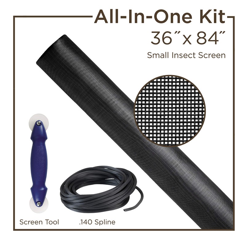 • Kit provides everything needed for an easy screen replacement: 36 in. x 84 in. fiberglass screen, . 140 in x 25 ft. spline and 1 spline implementation tool