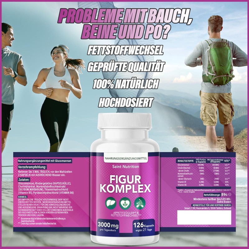 ProduktbeschreibungenKeine Grenzen fr Ihren Erfolg! Eine sorgf?ltig ausgew?hlte Kombination aus hochwertigen Inhaltsstoffen, perfekt abgestimmt auf Ihre 21-Tage-Kur. Qualit?t steht bei uns an oberster Stelle, weshalb unsere Figur Komplex Kapseln unter strengen Qualit?tsstandards und fortlaufender Hygienekontrolle in Deutschland produziert werden.Inhaltsstoffe / ZutatenGlucomannan, Rindergelatine (Kapselhlle), Cholinbitartrat, Mariendistelfruchtextrakt (Silybum Marianum), Thiaminhydrochlorid (Vitamin B1), Pyridoxinhydrochlorid (Vitamin B6)Gebrauchsanweisung2 Kapseln, 3 Mal t?glich. Die empfohlene t?gliche Verzehrmenge darf nicht berschritten werden. Nahrungserg?nzungsmittel stellen keinen Ersatz fr eine abwechslungsreiche und ausgewogene Ern?hrung dar. Nicht w?hrend der Schwangerschaft oder Stillzeit einnehmen. Au?erhalb der Reichweite von kleinen Kindern aufbewahren. Trocken und khl lagern.WarnhinweiseDie empfohlene t?gliche Verzehrmenge darf nicht berschritten werden. Nahrungserg?nzungsmittel stellen keinen Ersatz fr eine abwechslungsreiche und ausgewogene Ern?hrung dar. Nicht w?hrend der Schwangerschaft oder Stillzeit einnehmen. Au?erhalb der Reichweite von kleinen Kindern aufbewahren. Trocken und khl lagern.
