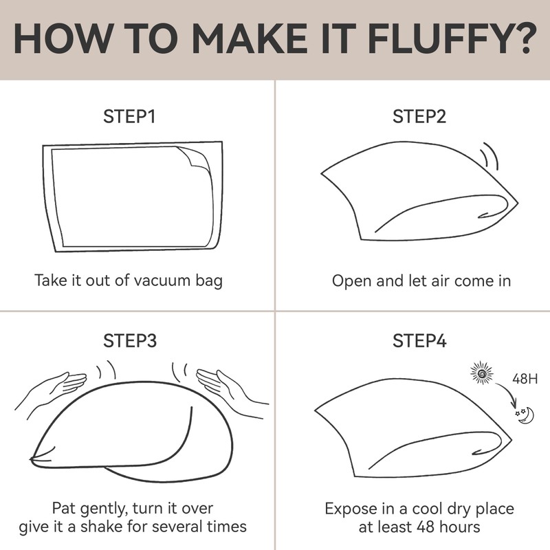 - Easy Care& Notice: If you are not suitable for down and feather products, please buy with caution. Our feather pillow is vacuum-packed for shipping, after receiving it, shake out and gently fluff it, allow several hours to recover their full loft. Or roll in the dryer at low temperature for 15 minutes to get a fluffy pillow