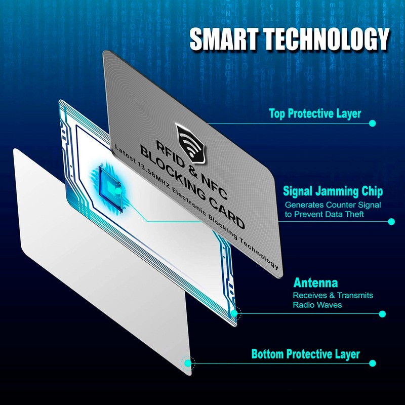 - JAMMING CHIP: An antenna and jamming chip makes up the main components of the card. The antenna will sense incoming radio waves and draw power for the chip to create a jamming signal. Lifetime usage as the card does not require battery.