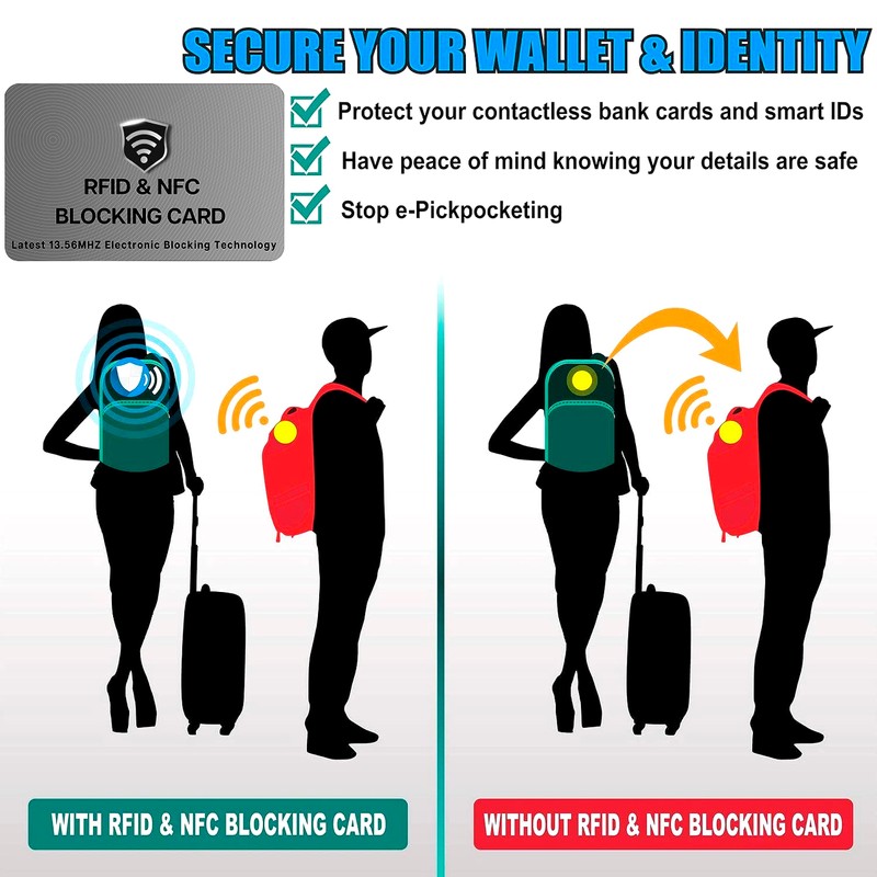 - SECURE YOUR WALLET FROM e-PICKPOCKETING: Prevent potential identity and financial theft through your contactless cards. Don’t become a victim e-theft in our growing contactless society. This is the simplest and most effective prevention solution! Block all RFID and NFC signal to secure your details and have peace of mind.