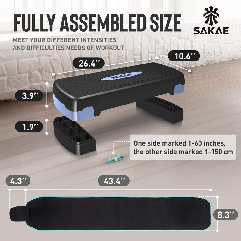 • All-in-One Exercise Set: Step platform features a diamond-textured surface for secure grip; four non-slip feet add stability and protect floors from scratches; set includes blue stepper, 43.4” W x 8.3” D waist trimmer, and measuring tape