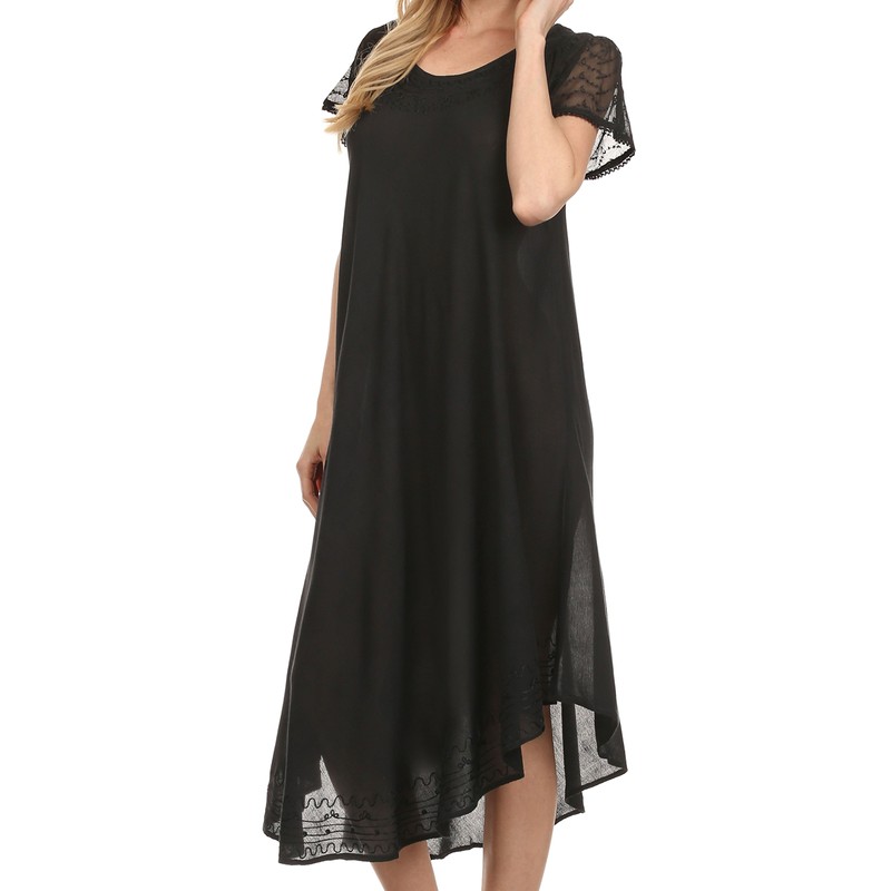 - Cap sleeve dress features solid colors, neckline and hem embroidery, sheer crepe cap sleeves and relaxed fit.
