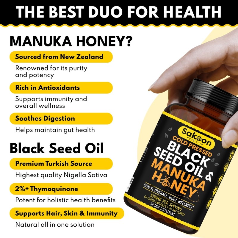 Sakoon nutrition Cold Pressed Black Seed Oil Capsules with Manuka Honey | Vegan Capsule | High Potency 2%+ Thymoquinone | Made in USA | 60 Count