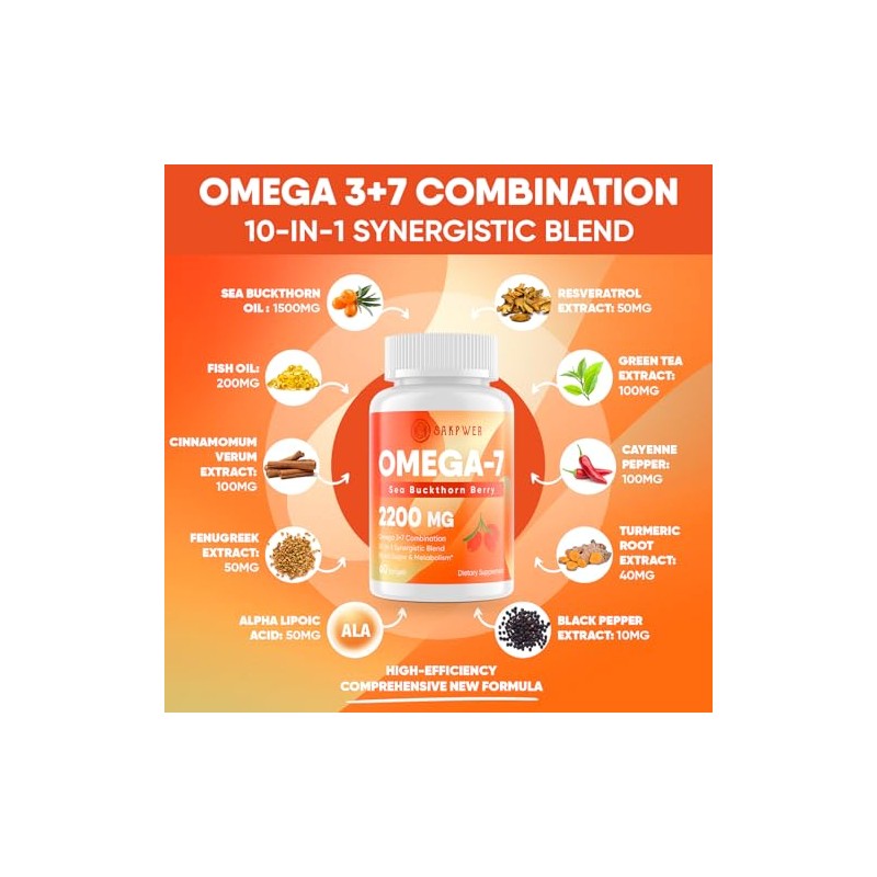 🌟 ⭐ Sakpwer- Omega7 Aceite de Espino Cerval de Mar con Omega3 EPA/DHA Aceite de Pescado, Cinnamomum, Alholva, ALA, Té Verde, Ca ⭐ 🌟