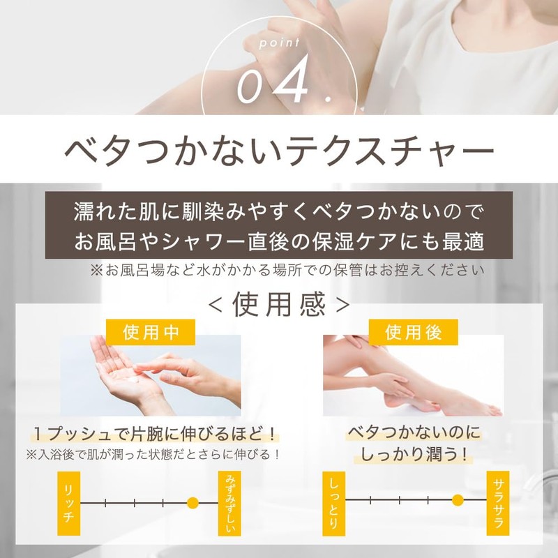 - ⭐【インバスケアにも最適、ベタつかないテクスチャー】塗れた肌に馴染みやすく、お風呂やシャワー直後の保湿ケアにも。入浴後のゴールデンタイムも無駄にせず徹底保湿!