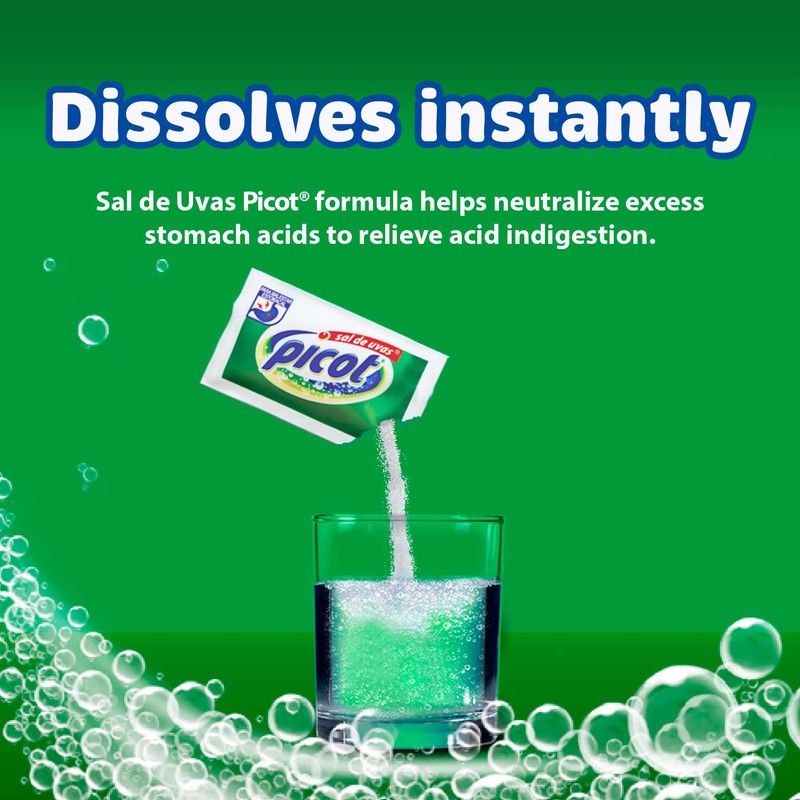 • Sal de Uvas Picot, an effervescent powder, dissolves very fast in the water. It helps adjust stomach pH and provides you with efficient and fast relief, reducing the stomach's heaviness.