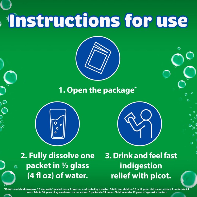 • Our formula is based on sodium bicarbonate and citric acid; both are antacids. These make Picot a helpful product for fast relief against acidity, reflux, and upset stomach.