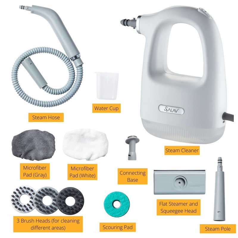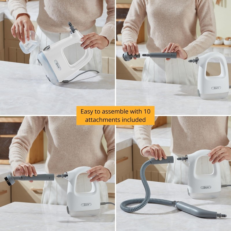 Introducing the CleanSteam Compact Steam Cleaner, SALAV's latest innovation in steam technology. This powerful cleaner delivers 1100 watts of pressurized steam, but allows you to refill instantly without any wait time. It effectively cleans hard-to-remove dirt, even the sticky and oily messes on gas stoves! Equipped with 10 versatile attachments, it can tackle various cleaning tasks around your home. Lightweight and easy to handle, the CleanSteam Compact Steam Cleaner is an essential tool for maintaining a spotless home!
