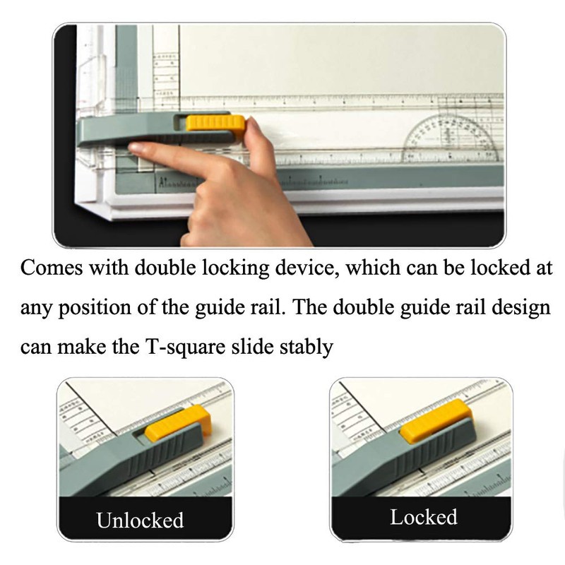 - The L-system straightedge design allows drawing along the top edge of the straight edge right down to the bottom of the sheet, with full accuracy and stability. The T-square straightedge slides up and down on a plastic runner,and maintains a nice 90°angle and can be locked into position on both sides of the board so that it doesn't move at all when you want it stable. With 12cm rotating ruler and 12cm triangle with angle attachment slide in a groove on the T-square, making it very easy to move