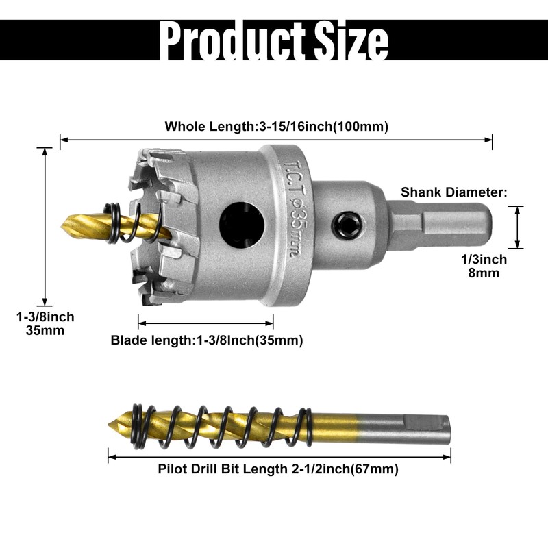 - Size cutting diameter: 1-3/8" (35mm) , cutting depth: 1 inch(60mm), shank dia.: 3/10 inch(8mm), perfect for drilling hard metal
