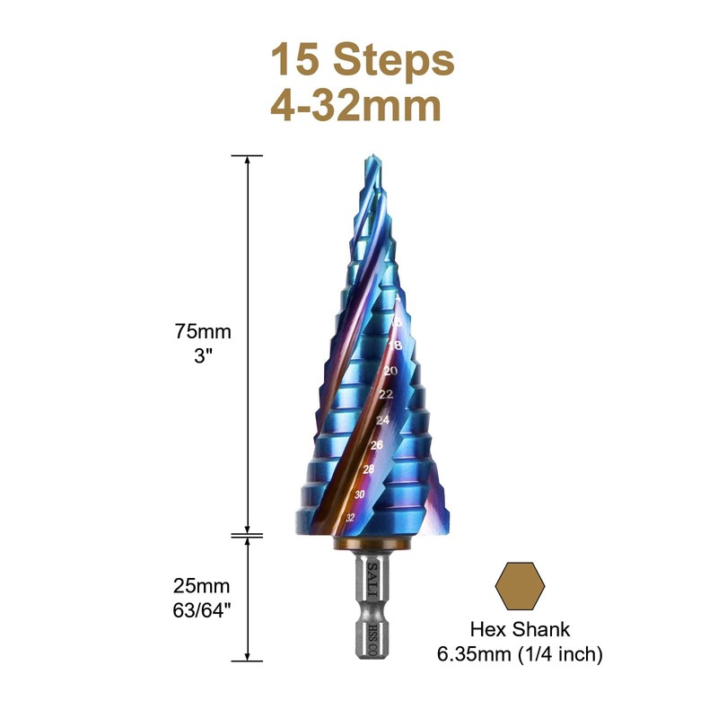 SALI M35 HSS Step Drill Bit 4-32 mm Four Spiral Flute Cobalt Step Drill 1/4" Hex Shank Quick Change Design High Speed Steel Step Drill Bit for Metal, Stainless Steel, Aluminum, Wood, Plastic