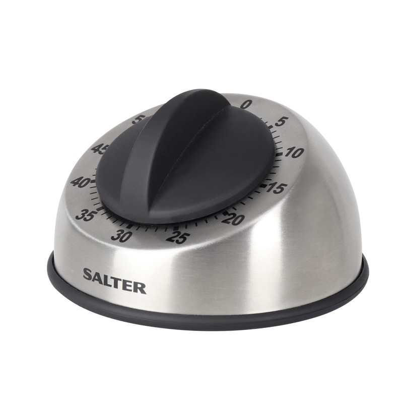 The Salter Mechanical 60 minute kitchen timer is a must for any busy kitchen. Its design explains why its a top choice for many chefs and busy parents, no batteries and a simple, large easy-grip dial with very loud traditional bell sound ring. Just wind up the timer to your desired time and off you go!