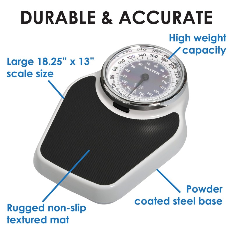 - CONSISTENT ACCURACY: This Salter scale is the pinnacle of timeless design and quality. This scale combines over 250 years of experience and accuracy. Easily calibrate this scale by turning the dial below the readout until the measurement shows zero..An oversized, 7.5-inch dial makes this scale easy to read. Large platform for comfortable foot positioning and stabilityThe powder-coated steel base is strong, durable, and easy to cleanThis item comes with a 5-year limited warranty