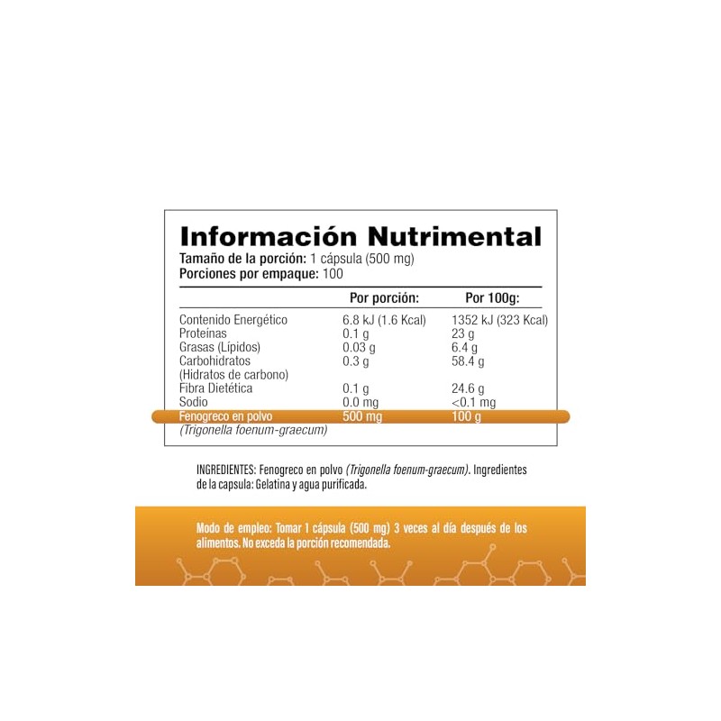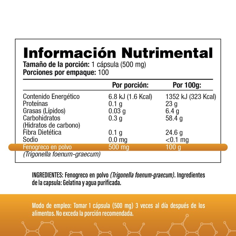 - Elaborado con polvo 100% natural de Semilla de Fenogreco, sin excipientes.