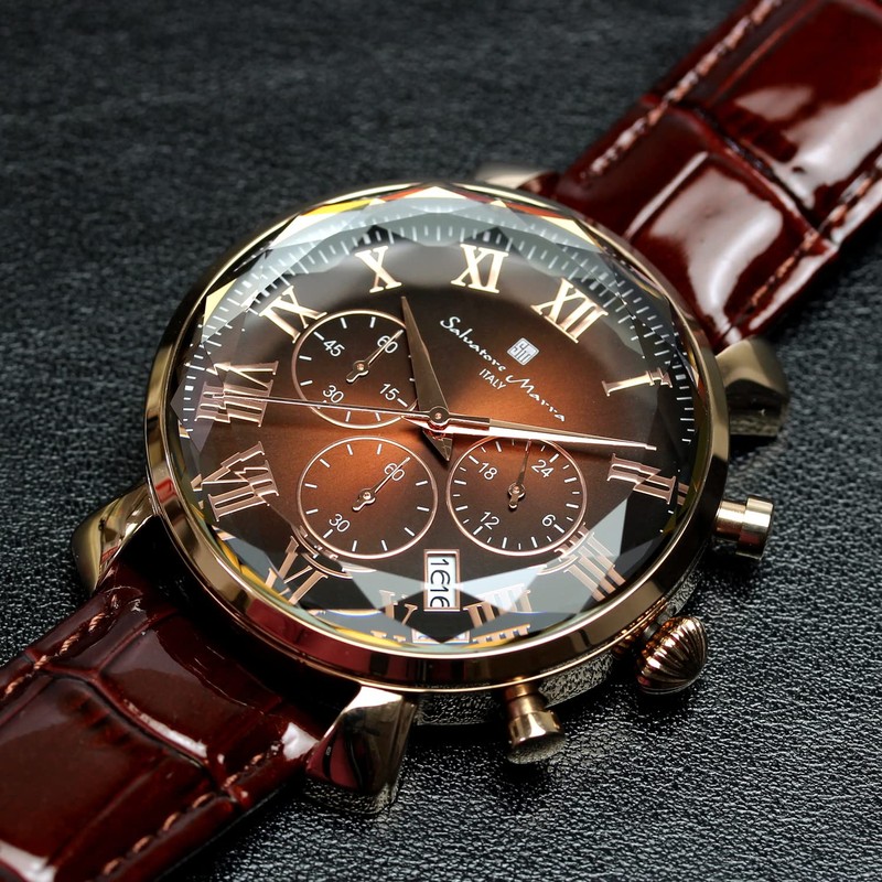 Salvatore Mara SM19104-PGBRBR Men's Watch, Watch, Multi-faceted Glass, Chronograph, Ice Croc Leather, Leather Strap, Brown, Braun, Classic