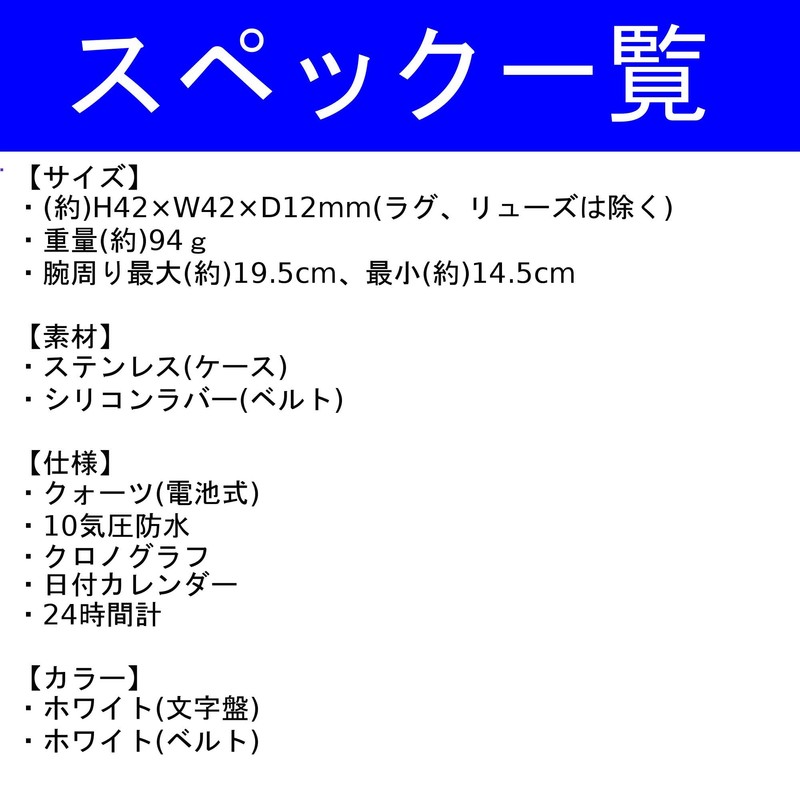 - [Product Details] Size (H x W x D): Approx. 1.7 x 1.7 x 0.5 inches (42 x 42 x 12 mm) (excluding lugs and crown); Maximum Wrist Circumference: Approx. 7.7 inches (19.5 cm); Min: Approx. 5.7 inches (14.5 cm); Weight: Approx. 3.0 oz (94 g); Material: Stainless steel; Strap: Silicone rubber; Color: Dial: White