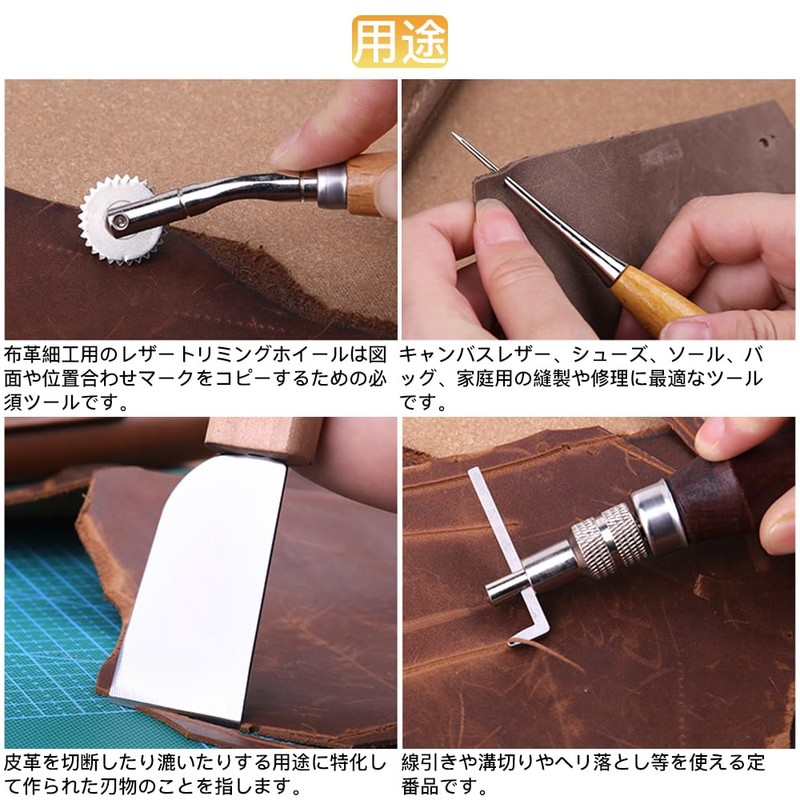 - Set Includes: 38 piece set. Finger sack x 1 (random color), hammer x 1, series x 3, sewing needles x 7, glue stick x 1, edge polishing x 1, wool derbar x 3, scissors x 1, measuring measure x 1, cobblestone x 1, leather trimming wheel x 2, leather edge grinding tool x 5, stitching groove x 1, diamond grain x 4, shawl x 2. , Straight Head Thousand Sheets. 2 loops and 1 straight blade for leather crafting