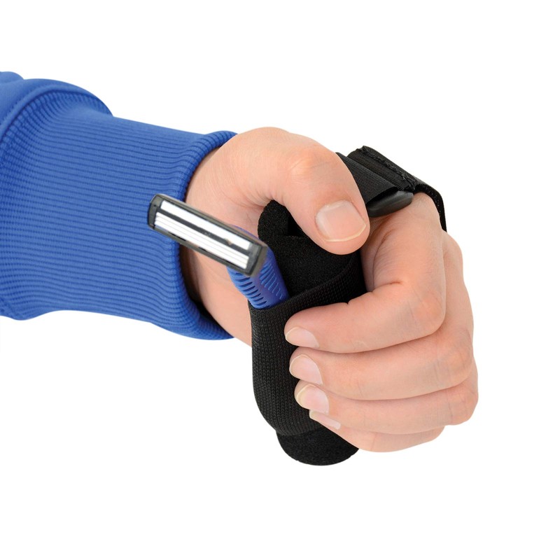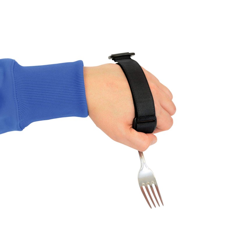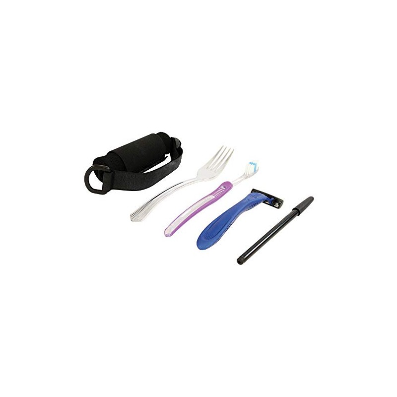 - Cuff with utensil pocket wraps around hand to securely hold utensils, grooming aids and writing instruments with various handle sizes and shapes for versatility