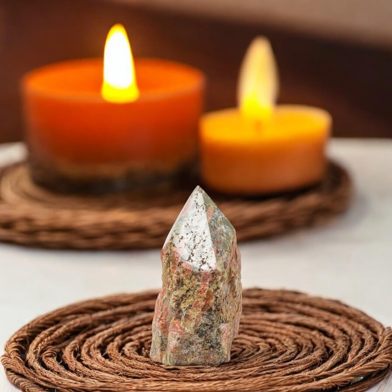 - Set of Two Unakite Crystal Points: Each set includes two hand-selected, polished Unakite crystal points, known for their nurturing energy and ability to promote emotional healing and balance.
