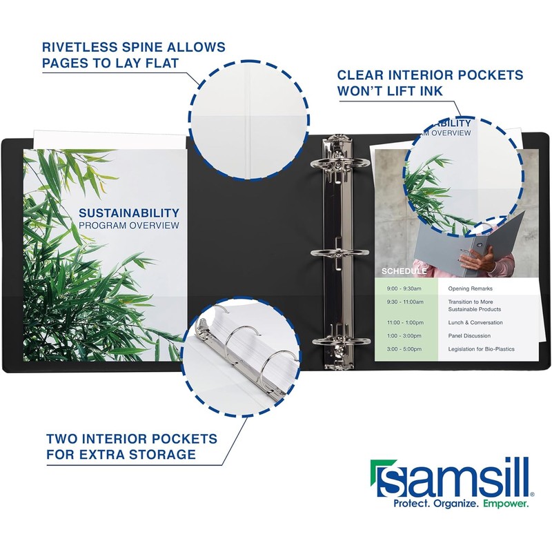 Samsill's three-ring binders make indispensable home, office, and school supplies. While many binders are available, our multipurpose business and school binder offers the economical paper storage and organizational value you've been searching for. This important document binder features a clear overlay along the front, back, and spine, allowing you to customize your presentations, projects, and more. Non-stick materials are used to make this product, which prevents ink transfer or lifting of the copy when materials are inserted into the cover or placed inside. Three binder rings with double boosters hold up to 325 8.5 x 11-inch letter-sized sheets with ease. The rings are mounted on the back lid, allowing pages to lie flat while preventing wear and tear on documents. 2 clear interior pockets provide additional storage with enough space for notes, photos, business cards, or full-size pages. Get crafty with our ring binders and create a baseball card binder, portfolio binder, recipe binder, trading card binder, savings binder, etc. The possibilities are endless!